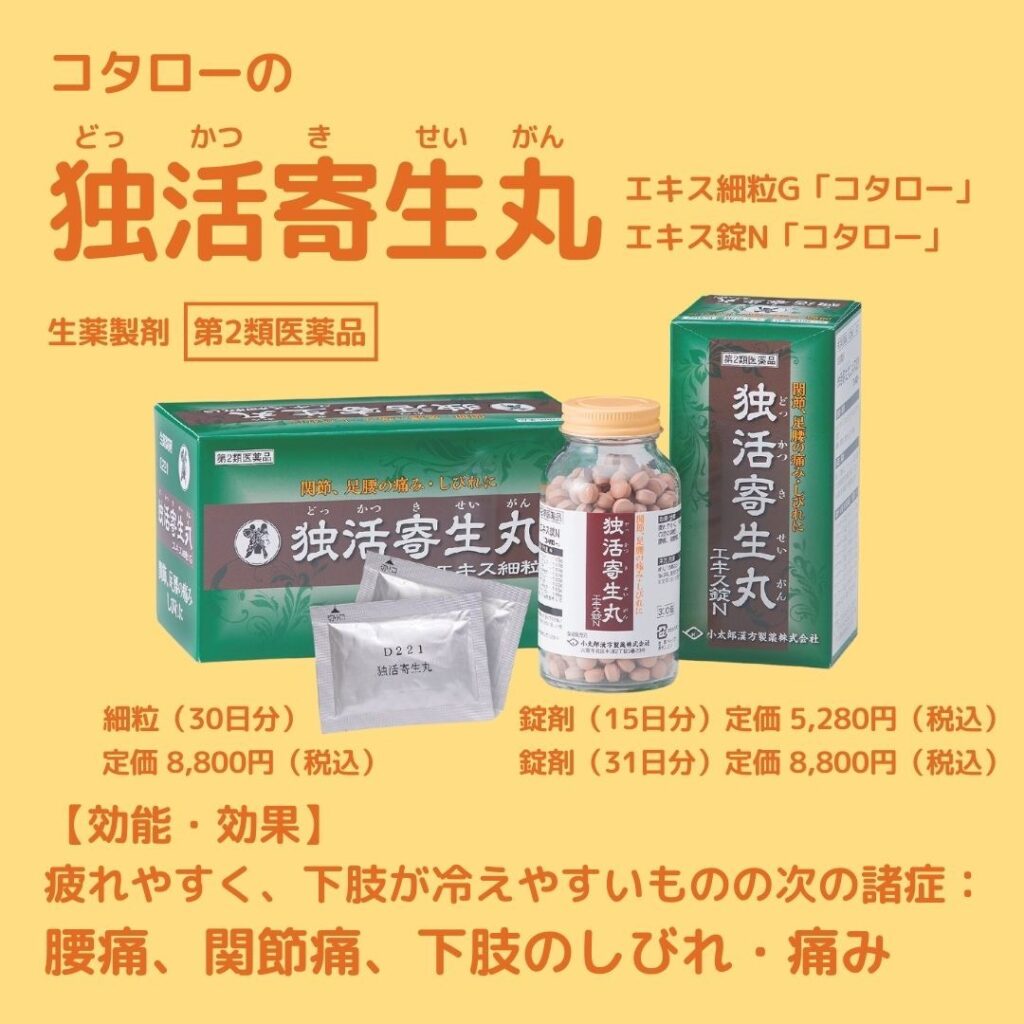 コタローの「独活寄生丸」は、生薬製剤の第2類医薬品です。